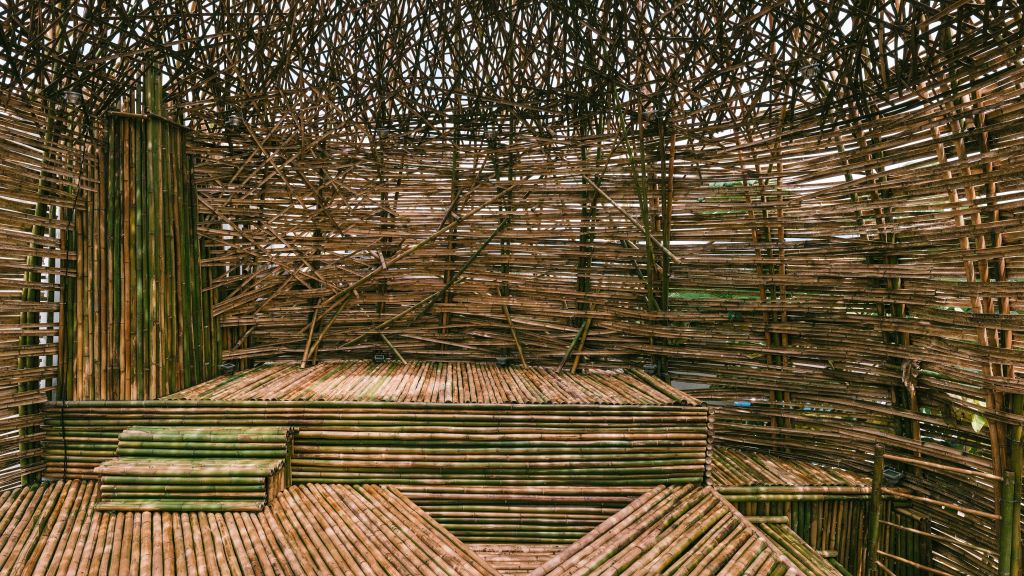 今年夏天,在台九線穿過鳳林鎮的路段、「美好花生」店鋪旁,一座八米高的竹材地景作品凜然坐落。以竹、籐等自然材質編織出的質樸與原始力量,讓內部空間像是一個能量承載體,不僅身體、心靈同步得到庇護,也在這個慢活小鎮創造出一座具有安定力量的場域,引導出與觀者間的靜謐對話。特別在這個大疫當前的時刻,提供了一處撫慰心靈的駐足點。