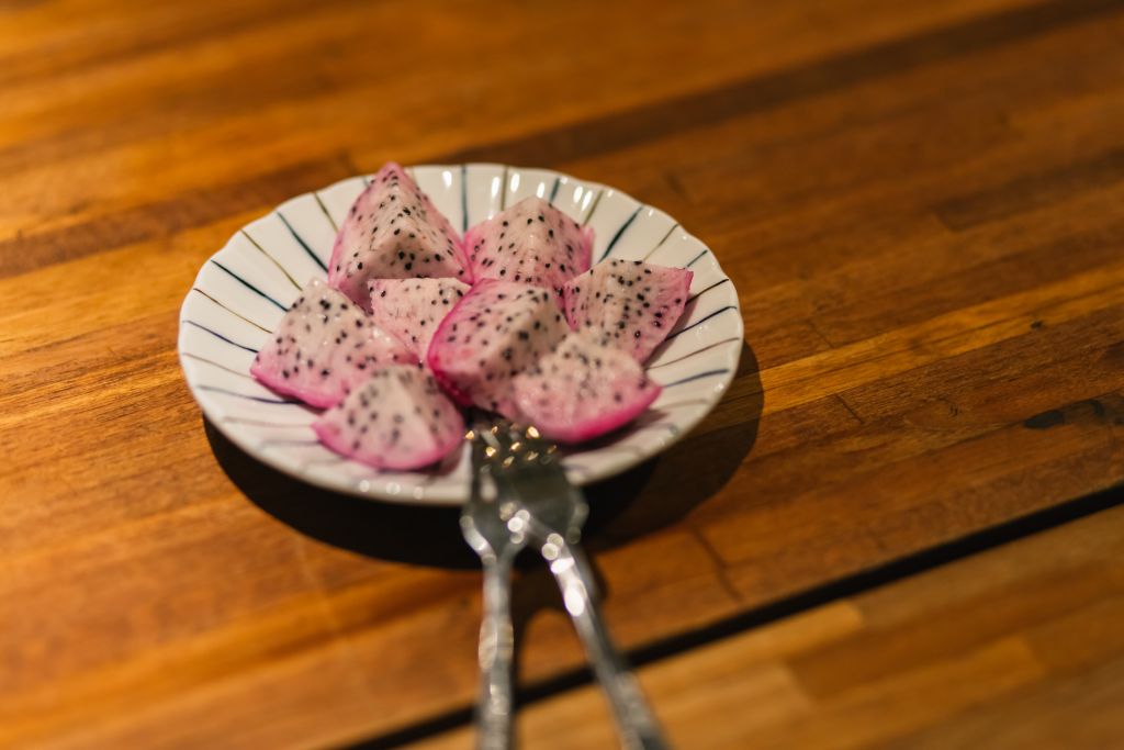 7月至12月是火龍果的盛產期。它夜間開花,有蜜蜂來授粉才會結果,每一批花會開十幾天的時間,從花開到結果約經歷兩個月時間,當花開到9月,就能採收到11月。不同於市面常見的紅肉與白肉兩種火龍果,雙色火龍果切開後的果肉帶著粉紅漸層色,同時述說著氣溫的變化:溫度高肉色就偏白,掛果時間短;溫度低肉色則會偏紅,冬天的掛果時間會多一個禮拜。